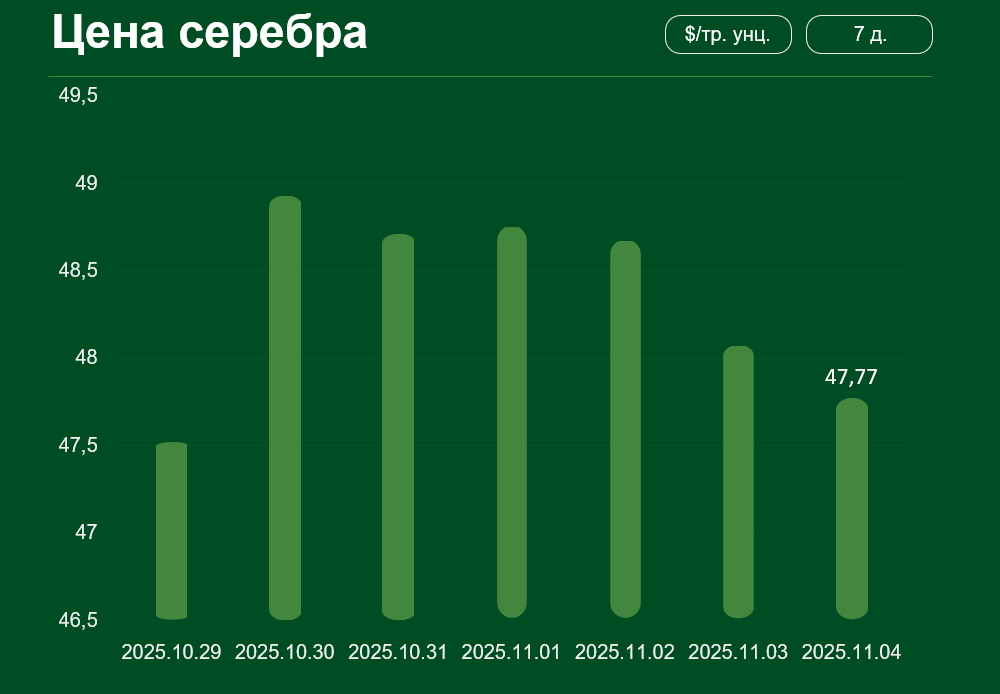 С 29 октября по 4 ноября мировая цена на серебро изменилась незначительно, достигнув 47,77 $ за тройскую унцию на 4 ноября.