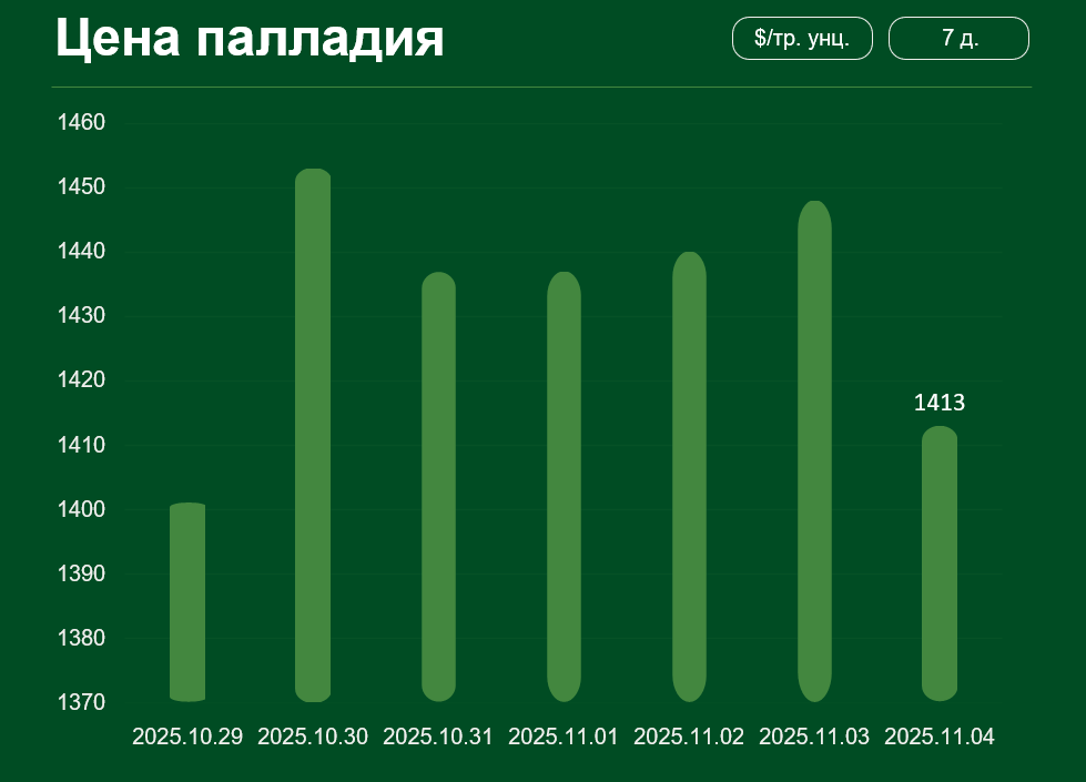 С 29 октября по 4 ноября мировая цена на палладий также изменилась минимально, достигнув 1413 $ за тройскую унцию.