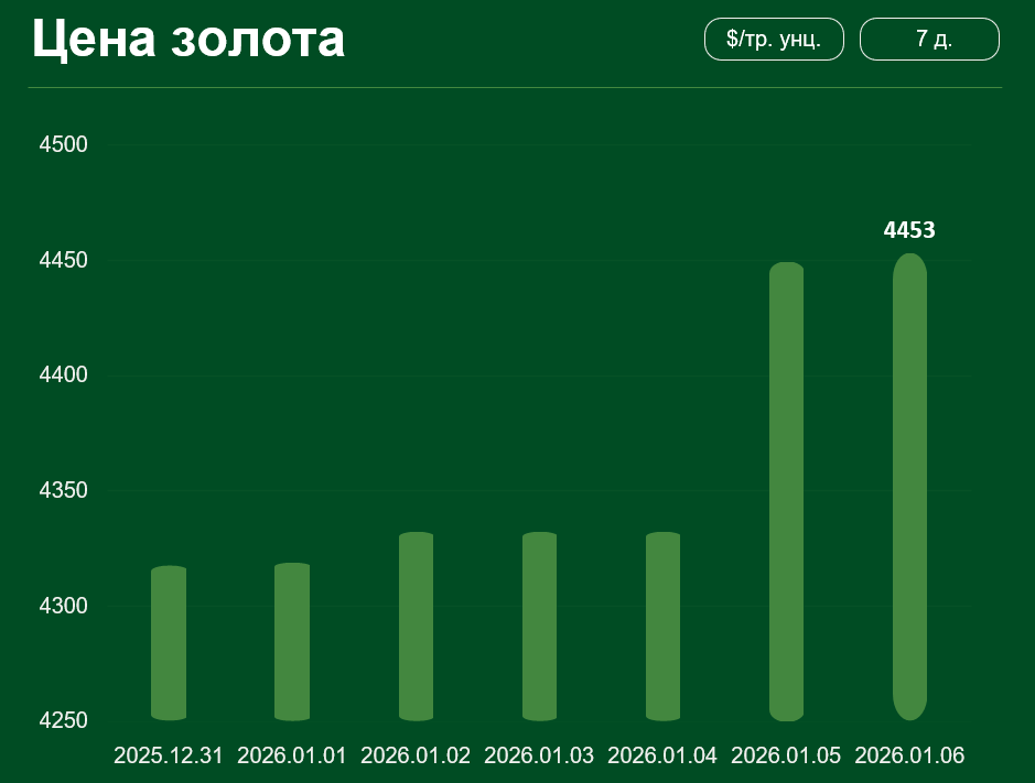 Мировая цена золота с 31 декабря по 6 января выросла более чем на 3% и достигла 4453 долларов США за тройскую унцию.