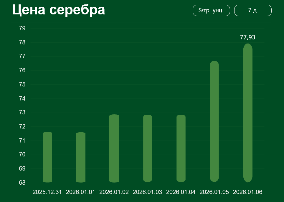 Мировая цена серебра с 31 декабря по 6 января выросла примерно на 8,8% и достигла 77,93 доллара США за тройскую унцию.