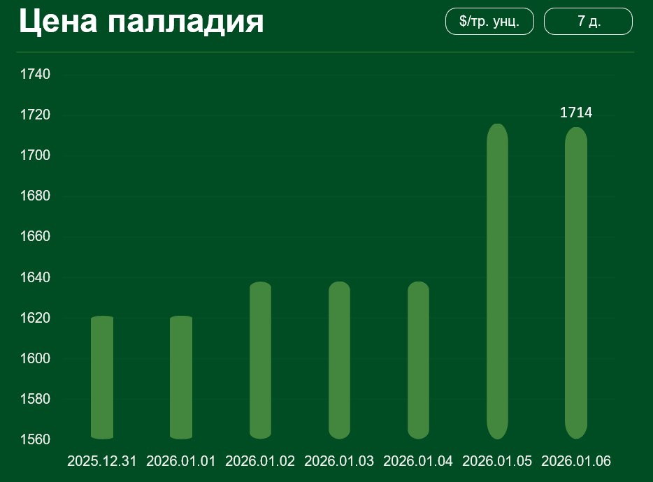 Мировая цена на палладий с 31 декабря по 6 января выросла примерно на 5,7% и достигла 1714 долларов США за тройскую унцию.