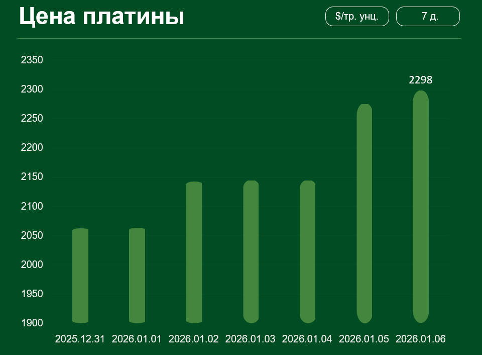 Мировая цена на платину также столкнулась с более заметным ростом. Цена на этот драгоценный металл с 31 декабря по 6 января выросла более чем на 11% и достигла 2298 долларов США за тройскую унцию.