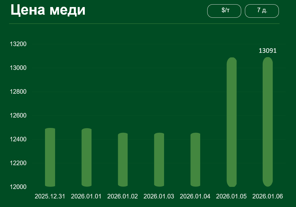 Мировая цена на медь с 31 декабря по 6 января выросла более чем на 4% и достигла 13 091 доллара США за тонну.